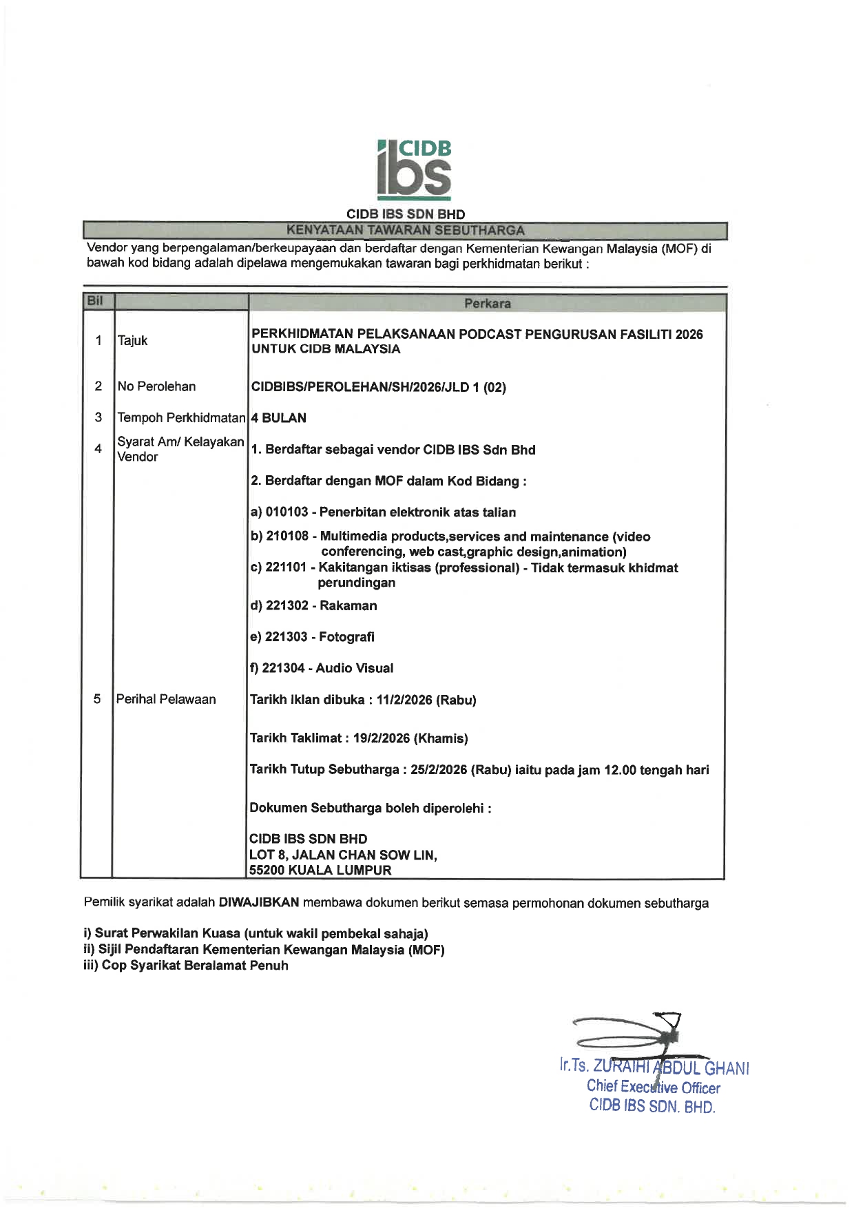 📢 CIDB IBS Sdn Bhd menjemput vendor yang berkelayakan untuk menyertai sebutharga berikut: