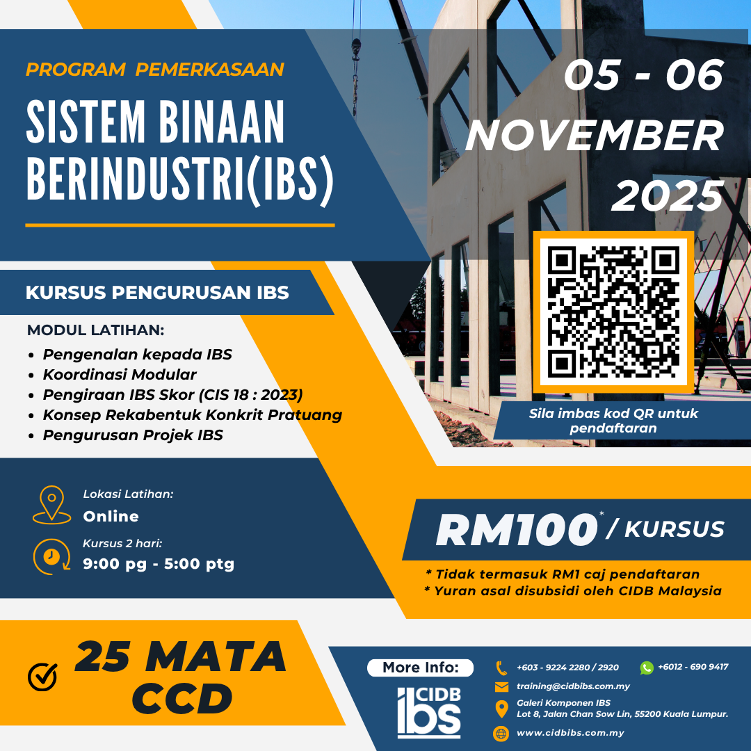 Program ini bertujuan untuk memberikan pendedahan serta pengetahuan kepada pemain Industri IBS. Program kursus ini akan dijalankan bermula pada bulan September hingga Disember 2022.